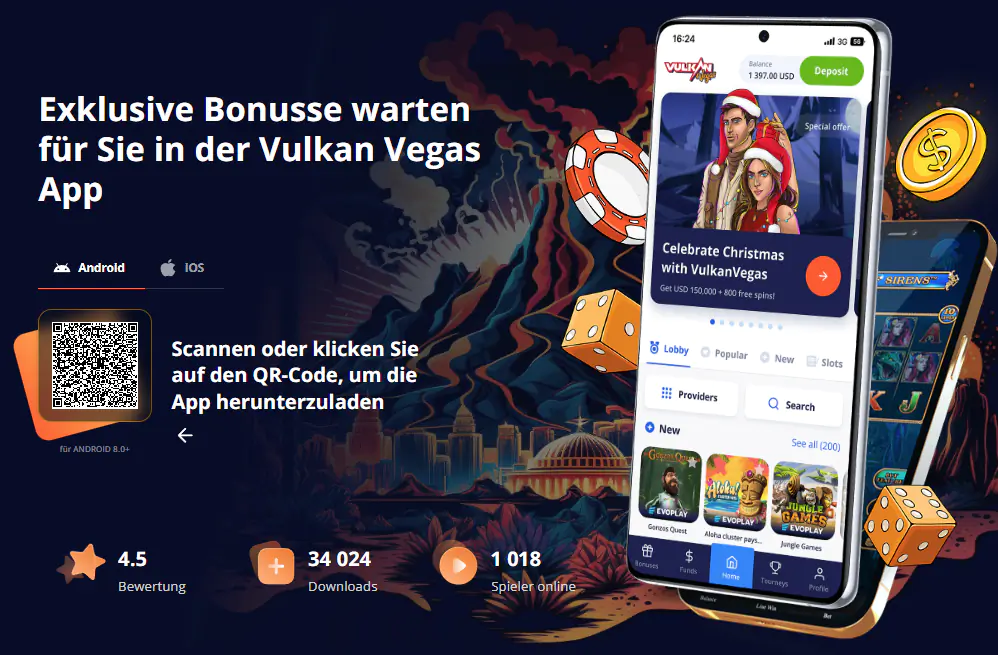 Wir haben den Download unserer Vulkan Vegas App so gestaltet, dass er für alle Nutzer schnell, sicher und verständlich ist. Unser Vulkan Vegas online casino ist sowohl auf mobilen Geräten als auch auf dem PC verfügbar. Am Desktop können unsere Spieler jederzeit direkt über den Browser spielen – ohne Installation. Für mobiles Spielen bieten wir eine speziell optimierte App-Lösung für Android sowie eine komfortable Web-App für iOS.